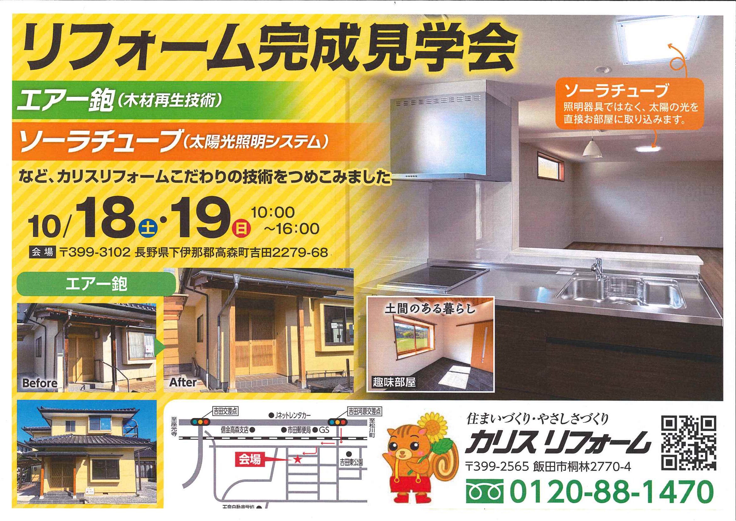 カリスリフォーム 〒399-2565長野県飯田市桐林2770-4 TEL 0265-26-7711 / FAX 0265-26-7750 受付時間 : 8:30 - 17:30 / 定休日 : 日・祝 ※日・祝の打合せをご希望の方は個別に対応させて頂きます。